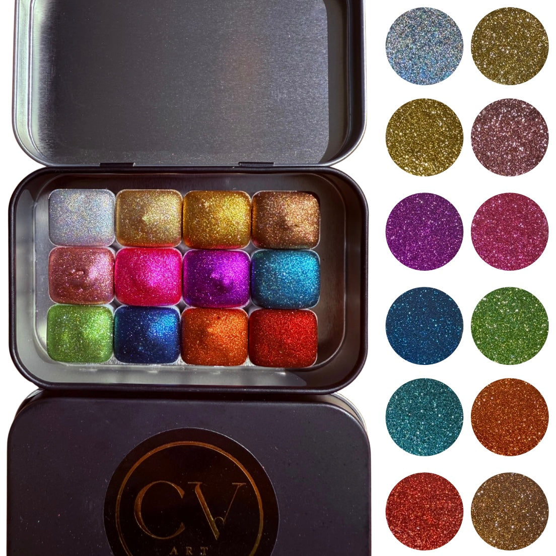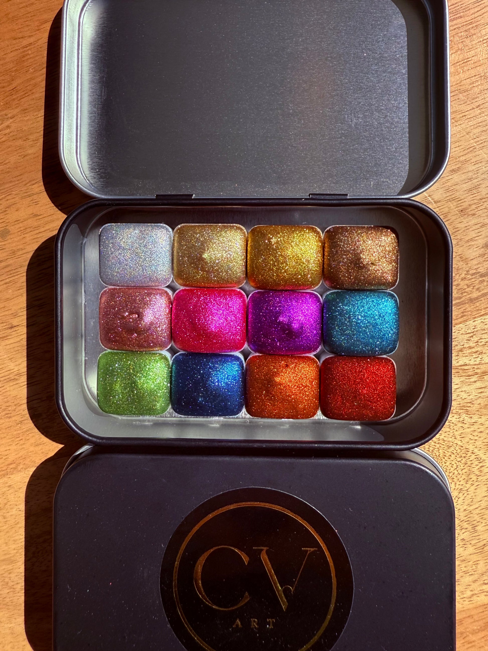 12 half pans of each colour in the Master Chrome Watercolour Set, tin case included